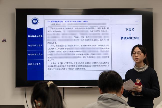 紧接着在研究内容与方法方面,李欣妍同学告诉大家要细化方案,确保其可行性,而研究内容与方法是申报书的核心支撑,例如在原料选择上,要明确材料的关键参数;制备条件方面,需考虑浓度、温度、时间等变量的影响;性能检测则要涵盖理化性能与特定功能等维度。讲座中以各类膜剂制备为例,详细拆解了如何将研究内容细化为可操作的步骤,让研究方案更具说服力,也为后续研究的开展提供清晰指引。