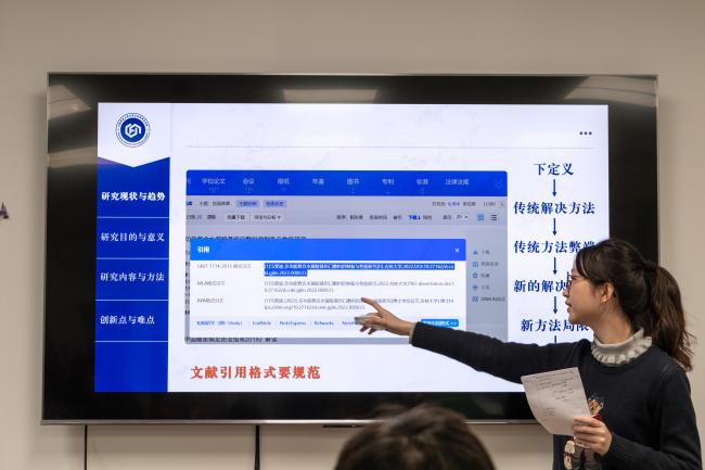 随后,李欣妍同学又分别从四个板块一一深入为同学们详细讲解。首先针对研究现状与趋势要梳理脉络,凸显调研深度,这一部分是申报书的基石,要先对研究主题下定义,再梳理传统解决方法及弊端,接着分析现有新方法的优势与局限,最后落脚到自身研究的依据。为了让大家更好地理解,李欣妍同学结合成膜材料研究案例为大家展开说明。通过案例,直观展示了如何系统阐述材料特征与已有研究,体现前期调研的充分性。同时,李欣妍同学特别提醒,文献引用格式务必规范,这是体现学术严谨性的重要细节。