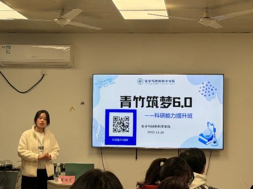 2025年11月26日,化学与材料科学学院在物理楼208开展了“青竹筑梦6.0——科研能力提升班”的知识讲堂。本次活动邀请到了2022级应用化学拔尖班葛洺言为同学们分享科研竞赛经验。