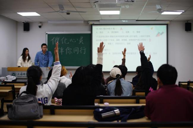在心理知识竞赛抢答环节,各位心理委员便踊跃举手、积极应答。互动抢答不仅检验了学习成果、巩固了关键知识,更激发了学习热情,营造了比学赶超的浓厚氛围,充分展现了心理委员扎实的专业基础与积极向上的风貌。