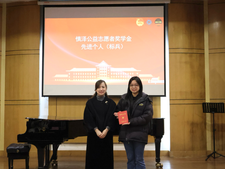 上海师范大学教育发展基金会副秘书长王军峰,音乐学院院长施忠为“慎泽公益志愿者奖学金”先进个人颁奖。