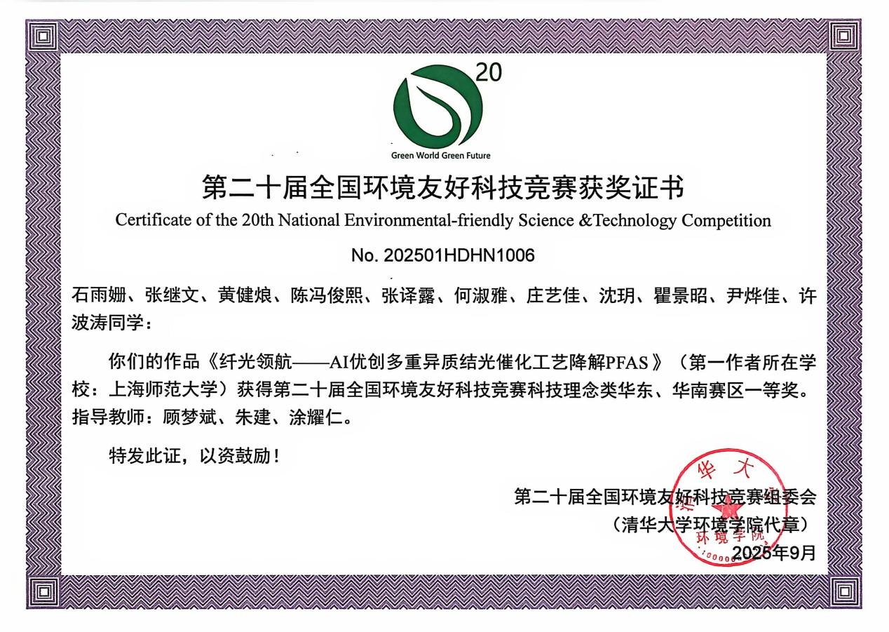近日,第二十届全国环境友好科技竞赛落下帷幕。上海师范大学环境与地理科学学院石雨姗同学带领团队,凭借作品《纤光领航——AI优创多重异质结光催化工艺降解PFAS》,先后斩获科技理念类华东、华南赛区一等奖与全国总决赛三等奖,用专业实力展现了环地学子在环境科研领域的创新探索与实践能力。