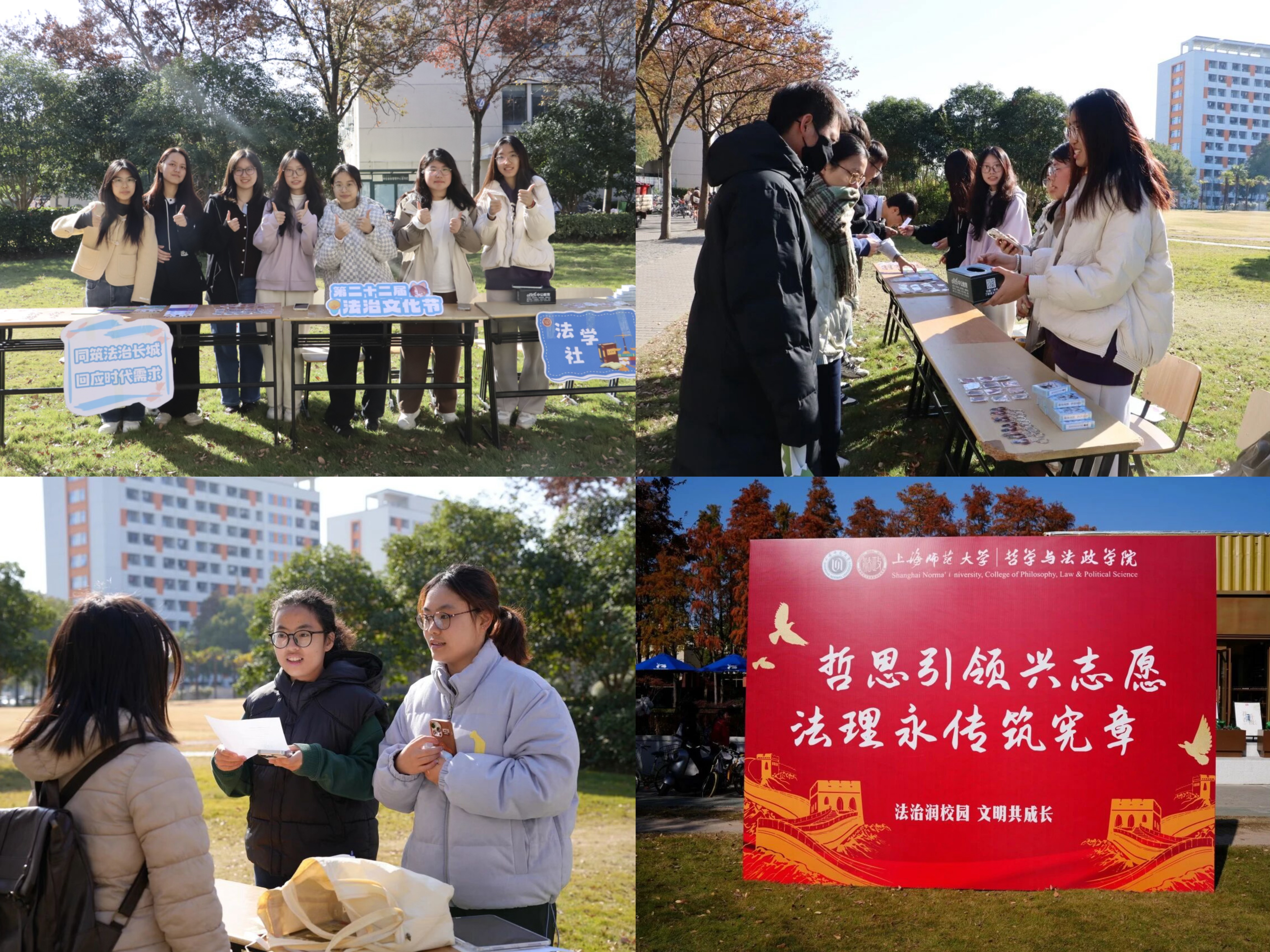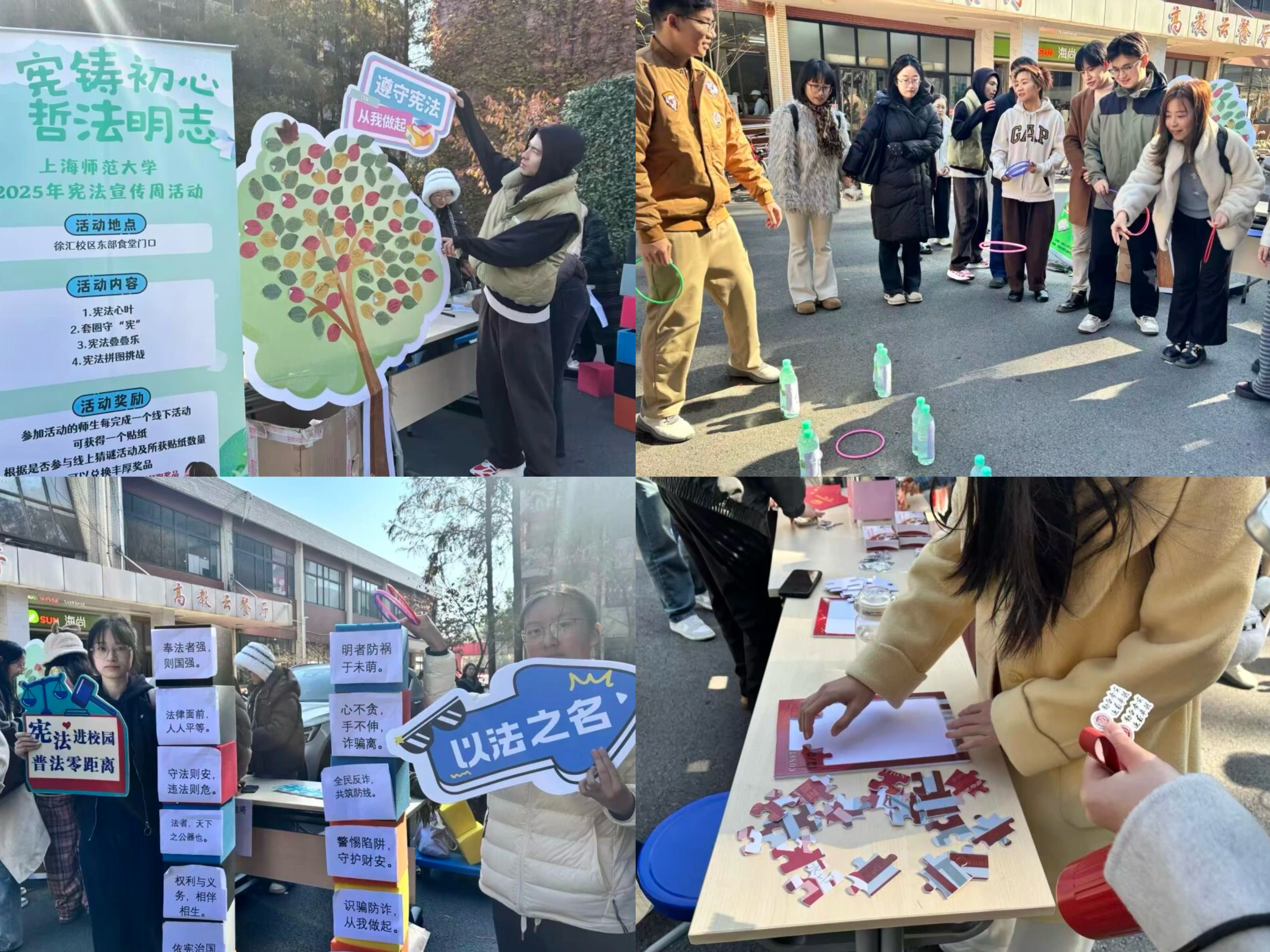 12月3日,学院在徐汇校区东部食堂门口举办“法政智慧,宪章未来”主题宪法宣传日活动。活动现场设置“宪法心叶”“套圈守‘宪’”“宪法叠叠乐”“宪法拼图挑战”四大特色环节,通过书写法治感悟、趣味套圈、搭建法治名言塔、拼图挑战等形式,让同学们在“玩中学、学中悟”,真正将宪法精神内化于心。
