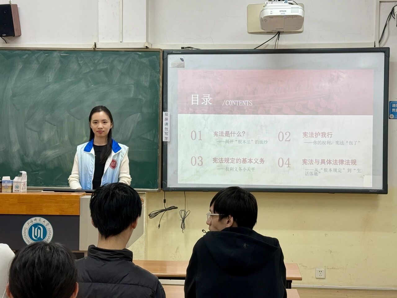 针对不同群体需求,学院组建专业宣讲团队,开展分层、分类的精准化宪法宣讲,确保宪法知识传递更具针对性与实效性。学院内,习近平法治思想学生宣讲团深入2025级本科各班,结合“校园生活中的权利保护”“宿舍安全与法律边界”等贴近新生的典型案例,将抽象宪法条款转化为看得见、用得上的生活指南。