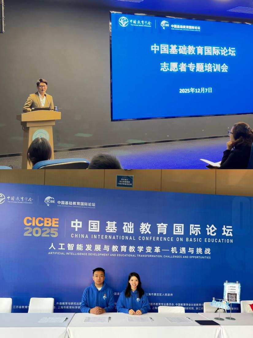 12月13日至14日,中国基础教育国际论坛(CICBE 2025)在上海嘉定盛大举办。本次论坛由中国教育学会、北京外国语大学、上海师范大学、上海市嘉定区人民政府联合主办,以“人工智能发展与教育教学变革——机遇与挑战”为核心主题,汇聚了全球13个国家近70位教育和人工智能领域的领军人才、知名专家学者,近400名国内外教育界同仁现场参会,共话智能时代基础教育发展新路径。在校基础教育处和校团委的指导下,外国语学院47名本研学生志愿者以语言为桥、以责任为肩,全程护航论坛顺利开展,用青春担当展现了新时代外语学子的专业素养与昂扬风貌。