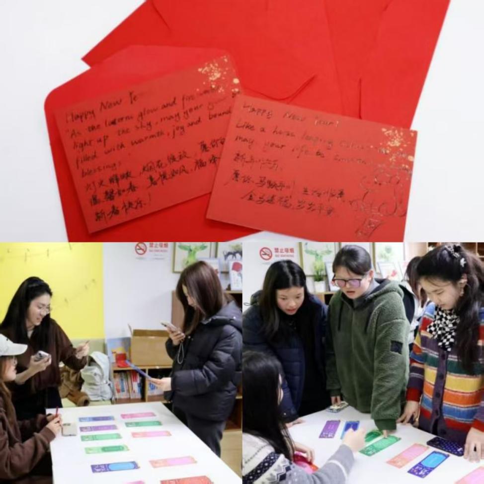 齐猜灯谜,暖意融融。同学们品味联想,集思广益,共同感受灯谜中的意趣。字谜精巧别致,尽显汉字形象之美;成语谜经典隽永,传递深厚文化内涵;事物谜精练传神,彰显汉语的灵动与神韵。成功解谜的同学,都会收获一张学院精心准备的双语手写元宵贺卡。红纸红卡相映,字里行间的祝福与温度,让这份节日喜悦更显绵长。