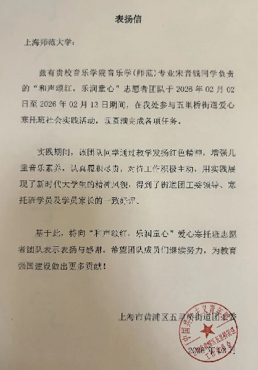 寒假期间,音乐学院共开展社会实践项目64项,200余名学生踊跃投身其中,涵盖爱心寒托班、返母校升学宣讲、社会调研、爱心课程开发、红色大寻访及场馆赛事志愿服务等多个领域,受到了一致好评,同时也收到了一封来自黄浦区五里桥街道团工委的表扬信!以专业所长服务社会所需,用青春热忱传递冬日暖意,在躬身实践中诠释新时代青年的奉献与担当。