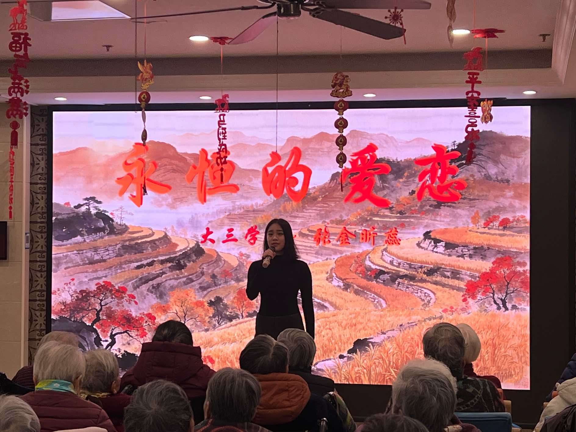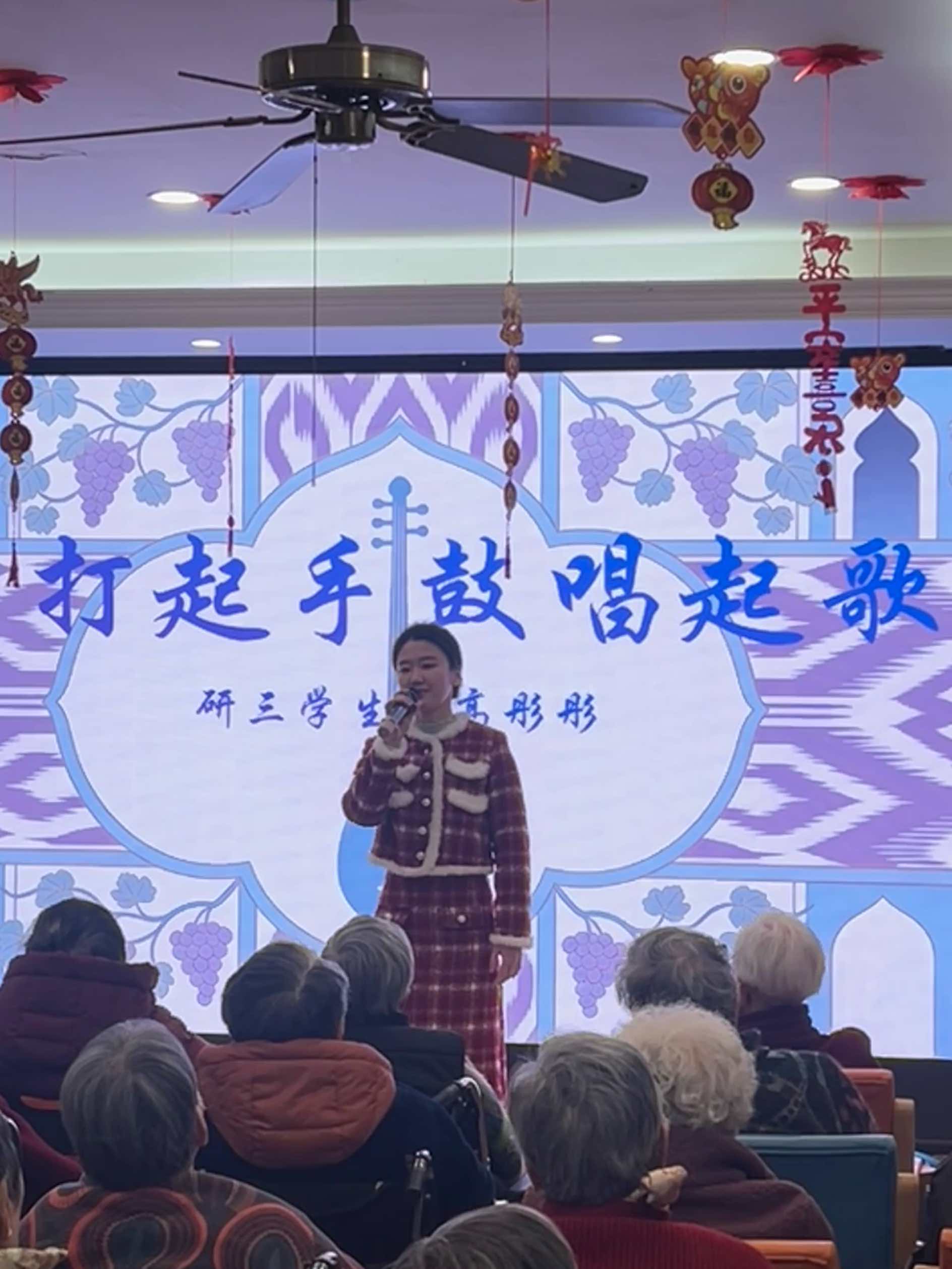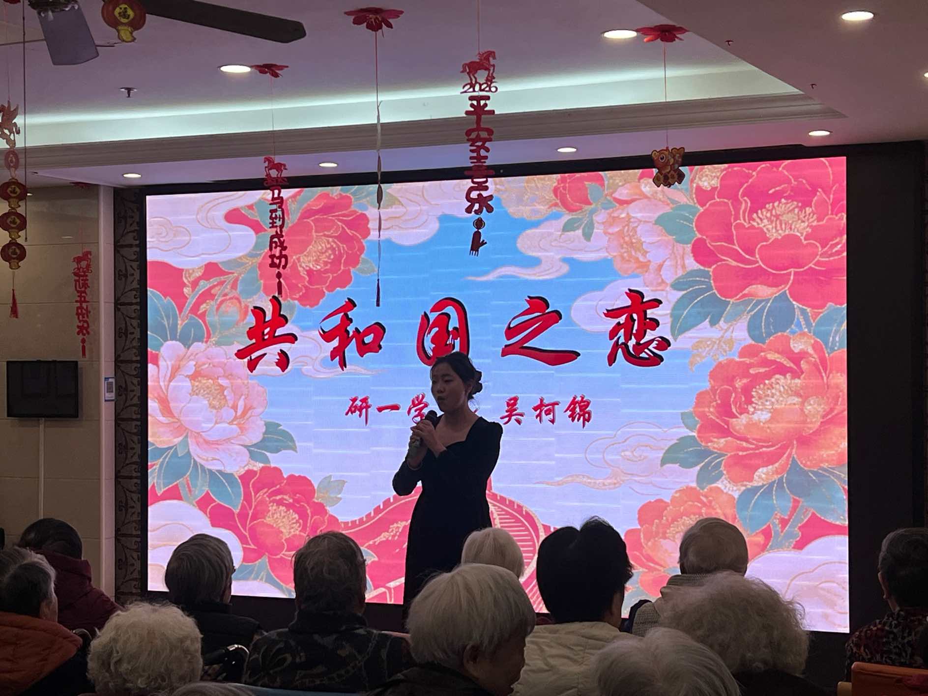 合唱与独唱曲目各有韵味,大一张轶程与大三陶悦悦合唱的《康定情歌》,经典旋律勾起美好回忆,老人们跟着节奏轻轻哼唱;张金昕蕊《永恒的爱恋》、研三高彤彤《打起手鼓唱起歌》,或温柔缱绻,或热情洋溢,每一首都唱到了老人们的心坎里。岑乐今倾情演唱《我爱你中国》,豪迈的歌声点燃全场爱国情怀,研一沈如一、王心雨带来的《梨花又开放》,温柔的旋律满是诗意与温情。