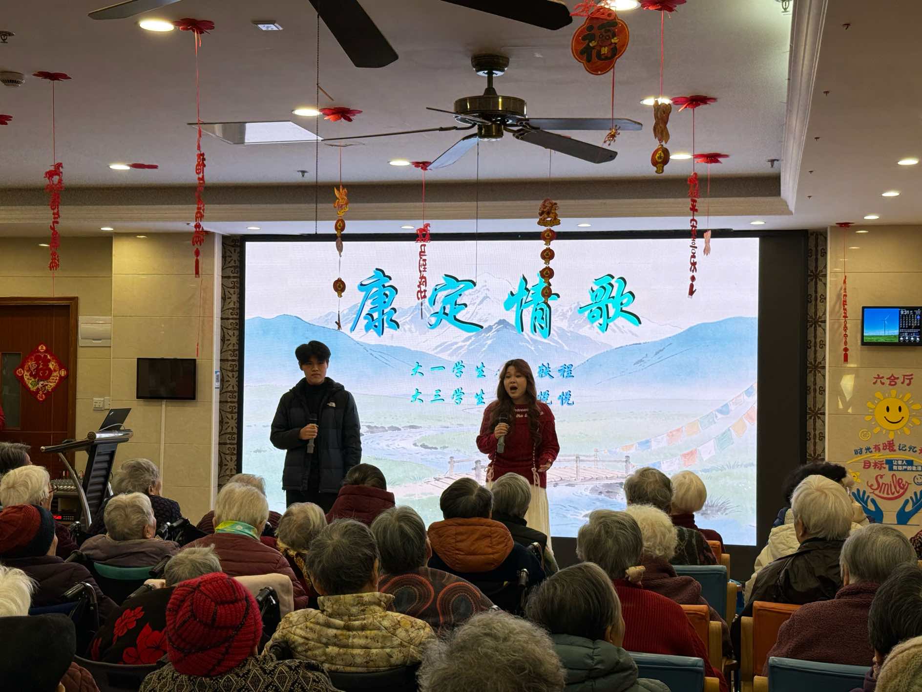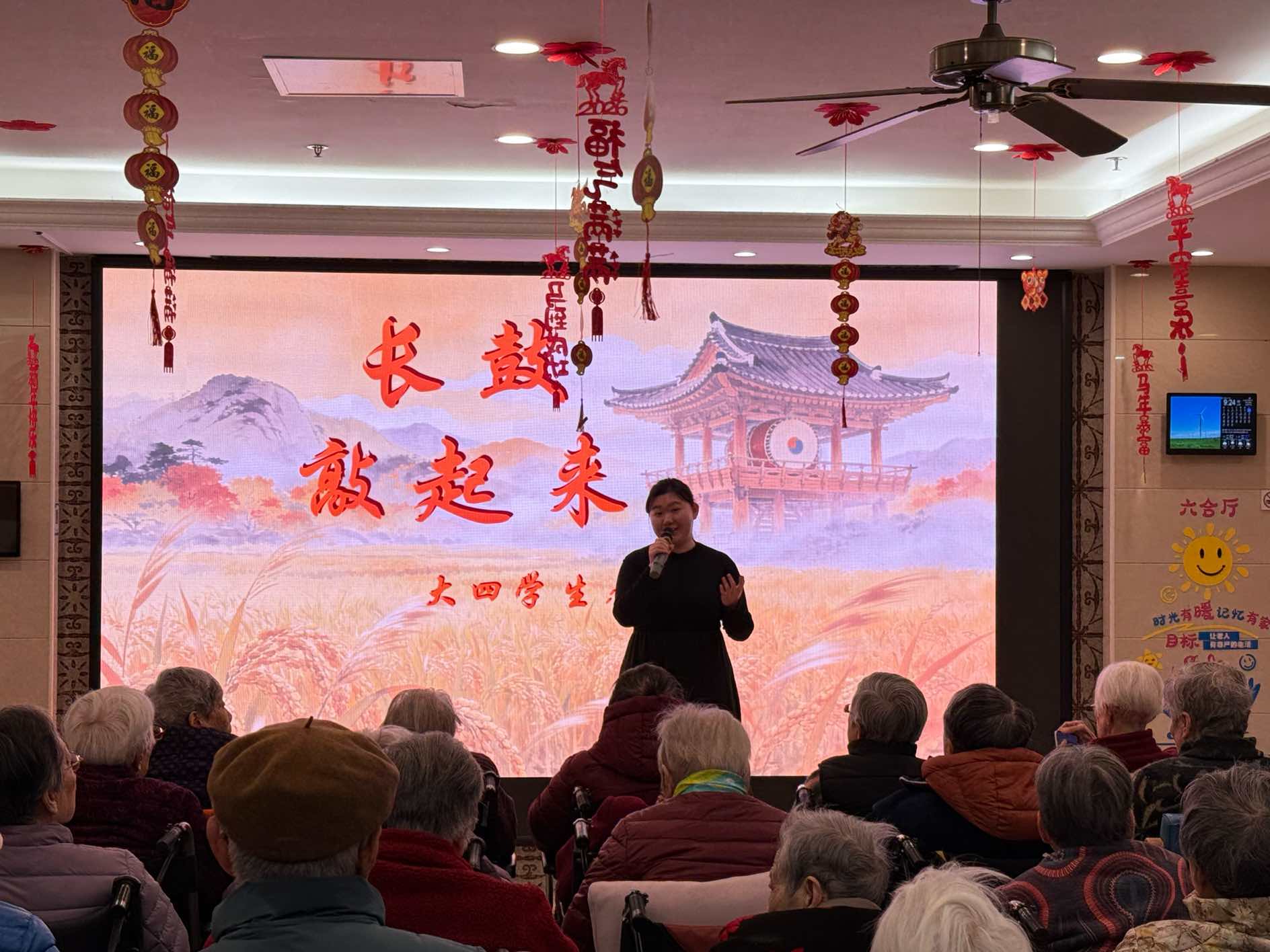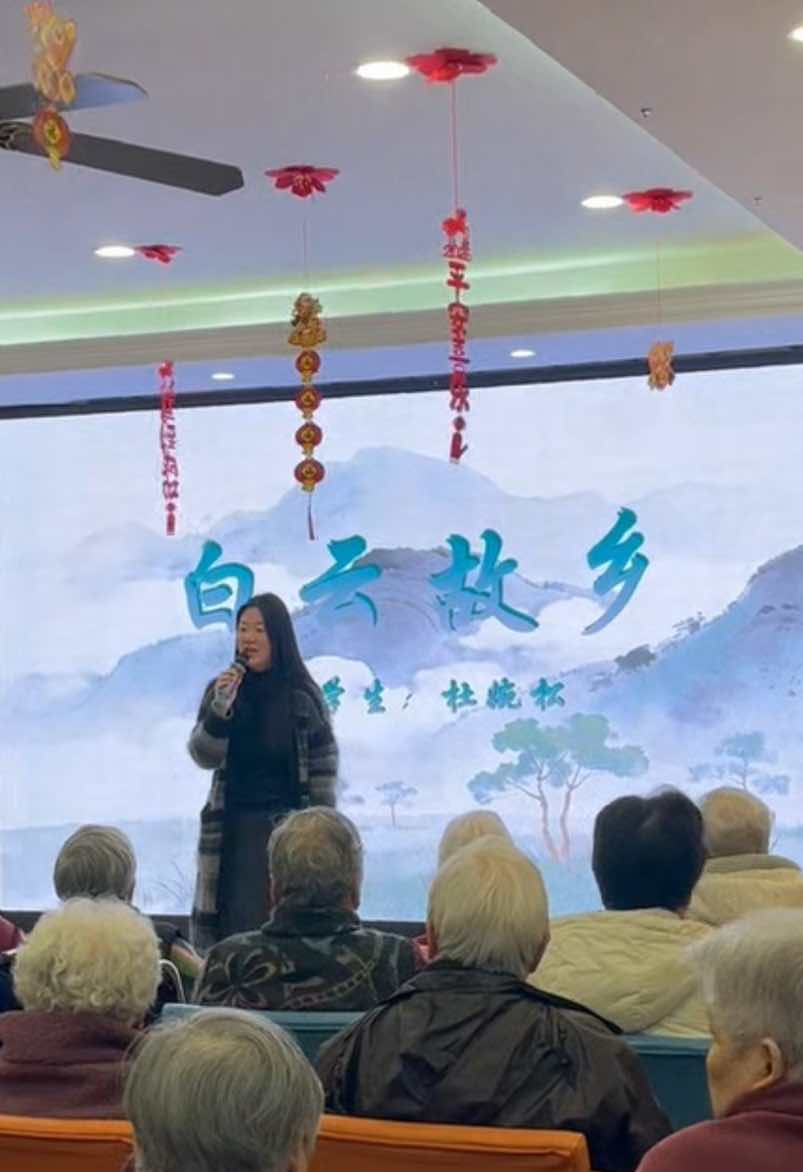 合唱与独唱曲目各有韵味,大一张轶程与大三陶悦悦合唱的《康定情歌》,经典旋律勾起美好回忆,老人们跟着节奏轻轻哼唱;张金昕蕊《永恒的爱恋》、研三高彤彤《打起手鼓唱起歌》,或温柔缱绻,或热情洋溢,每一首都唱到了老人们的心坎里。岑乐今倾情演唱《我爱你中国》,豪迈的歌声点燃全场爱国情怀,研一沈如一、王心雨带来的《梨花又开放》,温柔的旋律满是诗意与温情。