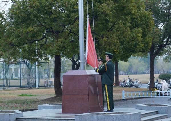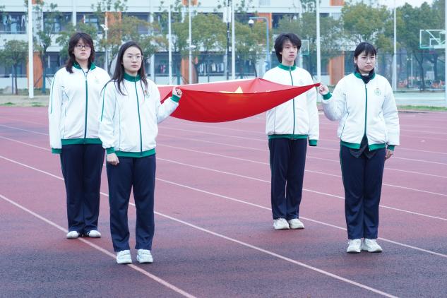 随着激昂的《义勇军进行曲》奏响,五星红旗在晨光中迎风舒展。全体师生行注目礼,齐声高唱国歌。
