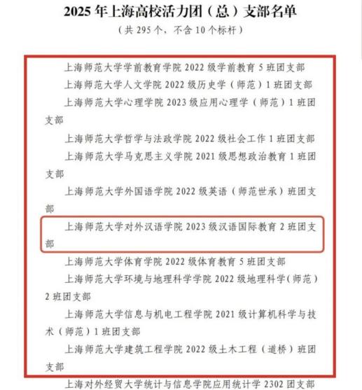 近日,共青团上海市委员会、上海市教育委员会联合发布了《2025年上海高校、高中阶段学校活力团组织、活力社团、团干部典型遴选结果》。经过层层选拔与激烈角逐,上海师范大学对外汉语学院2023级汉语国际教育2班团支部凭借扎实的组织建设、鲜明的专业特色和突出的社会贡献,从全市众多基层团支部中脱颖而出,荣获“2025年上海高校活力团支部”荣誉称号!