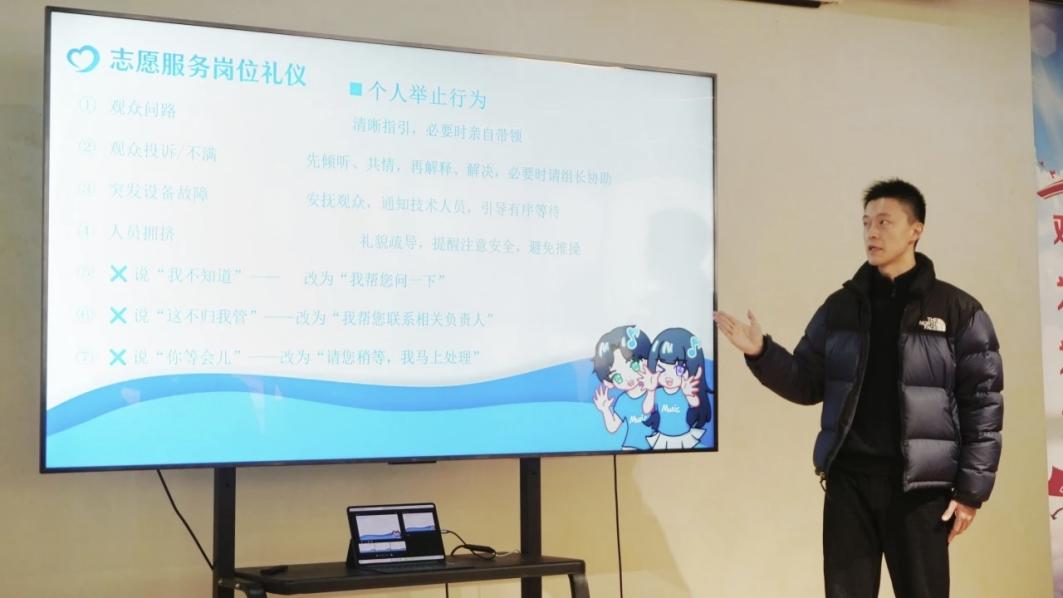 院团委书记陶泽文结合“上海之春”服务场景,明确了志愿者的岗位职责、服务礼仪与沟通规范,细致拆解不同岗位的工作流程与注意事项,并针对突发情况分享了应对技巧与服务心得。