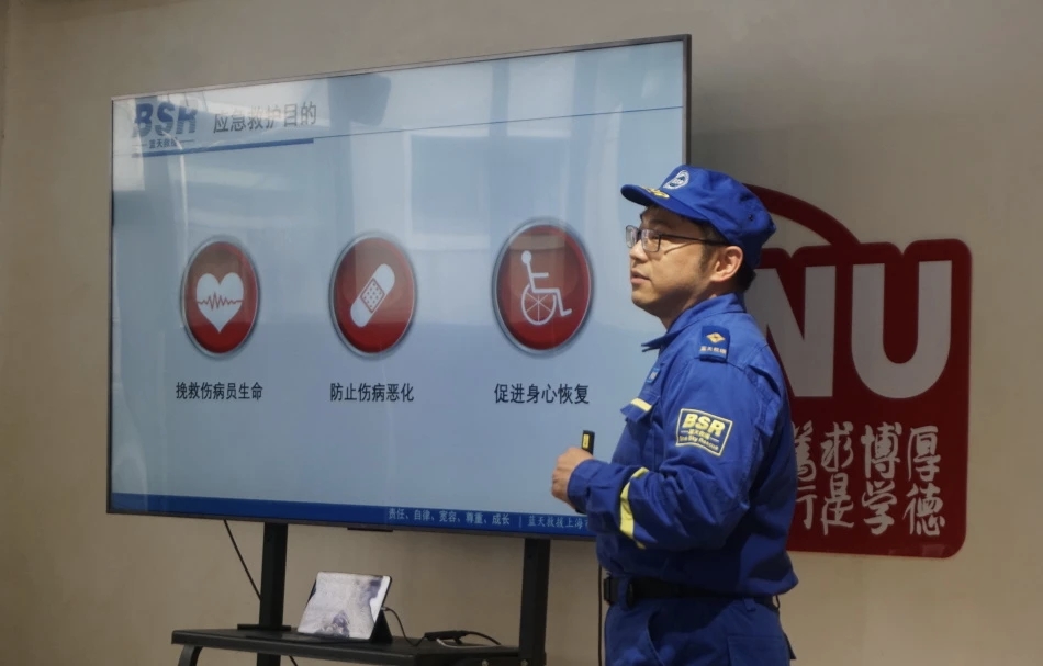 此次培训旨在让志愿者在服务前掌握必要的急救技能,筑牢安全防线,同时明晰岗位职责、提升服务素养,以专业、热情的状态投入艺术展示周各项工作。蓝天救援队专业讲师围绕生活中常见突发健康风险,系统讲解了心肺复苏(CPR)的操作流程、自动体外除颤器(AED)的使用方法以及气道异物梗阻的急救技巧。通过理论讲解与实操演示相结合的方式,同学们积极参与互动练习,在模拟场景中亲身体验急救操作,切实掌握应急核心技能。