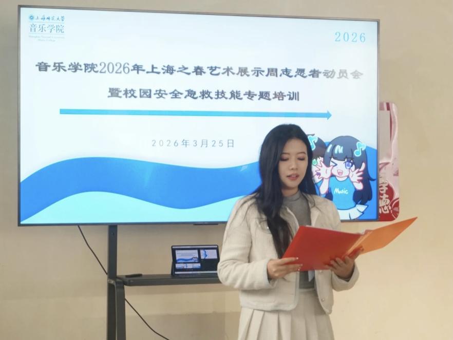 2026年“上海之春”艺术展示周开幕之际,音乐学院本研70余名学生志愿者将承担6场演出的服务保障工作。为提升志愿服务质量与安全应急能力,学院于3月25日下午举行志愿者动员会暨岗位安全技能培训。会议特邀上海蓝天救援队队员担任主讲嘉宾,音乐学院党委副书记、副院长杨纯婷、院艺术实践部主任苗小龙、院团委书记陶泽文出席,院团委副书记江思颖主持会议。